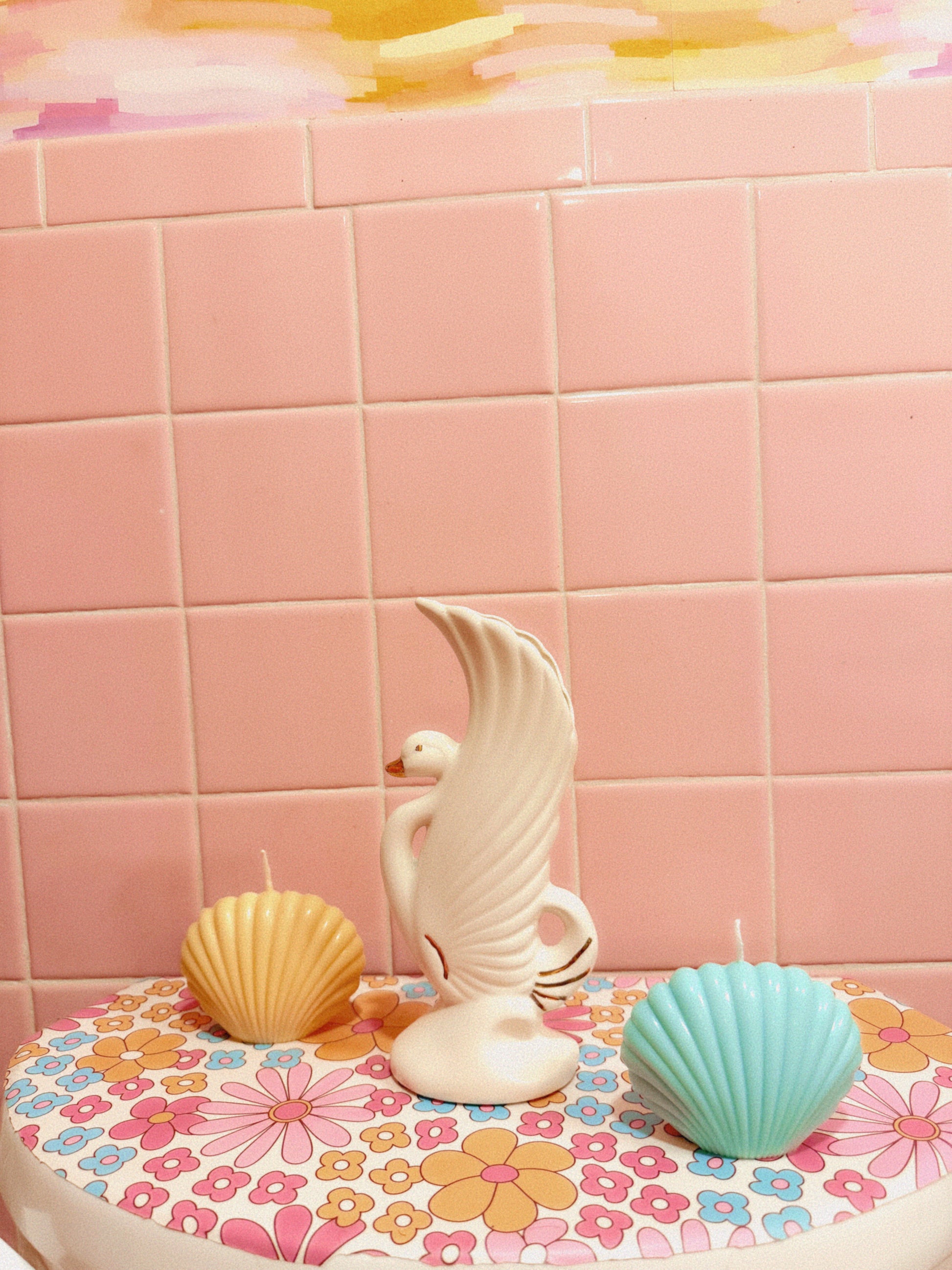 Bring a splash of nostalgia and a breeze of coastal charm to your space with our pastel shell candles. Hand-poured with 100% soy wax, these cuties are shaped like vintage seashells and come in dreamy colors like Buttercream Yellow, Ocean Blue and more! Whether styled in your bathroom, bedroom, or bookshelf, they instantly add a playful pop of color and whimsy.